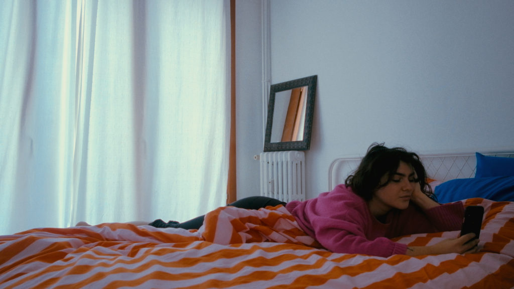 Le clip se découpe en deux parties et alterne entre l’une et l’autre. Des séquences cinématographiques où l’on suit la journée d’une jeune femme, elle ne quitte jamais son téléphone, elle lui parle et il l’accompagne dans sa routine quotidienne. Et de l’autre des séquences tournées en studio avec le groupe, la projection de textures vhs les éclairent, sont-ils eux même à l’intérieur du téléphone ?